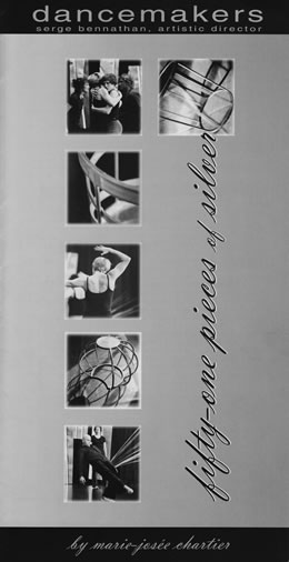 In April 2002, Bennathan invited guest choreographer Marie-Josée Chartier to create a full-length work for the company. Chartier has developed a distinctive style of dance that draws heavily on her fascination with contemporary music and visual art. In fifty-one pieces of silver, she set a silvery stage of sculpture, sound, space, and texture – a landscape in which the dancers were the powerful, physical force interacting with, and within, a still life full of its own mystery and meaning. fifty-one pieces of silver premiered at Harbourfront’s Premiere Dance Theatre April 23-27, 2002.