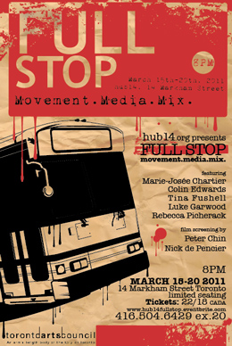 FULL STOP is a new site-specific dance work inspired by the Gemini Award winning dance-film Streetcar (2004) by Peter Chin and Nick de Pencier. Streetcar brings to life the inner journey of a tired commuter heading home with his fellow passengers. full stop brings together new sets of eclectic personalities colliding in a shared space; hub14 is the public meeting zone where these evocative characters gather. Marie-Josée Chartier appears in the film but embodies a new persona in full stop, joined by an incredible group of performers including: Luke Garwood, Tina Fushell and Colin Edwards.
